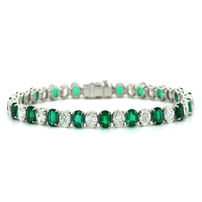 Platinum line bracelet alternating with oval emerald and oval diamonds.