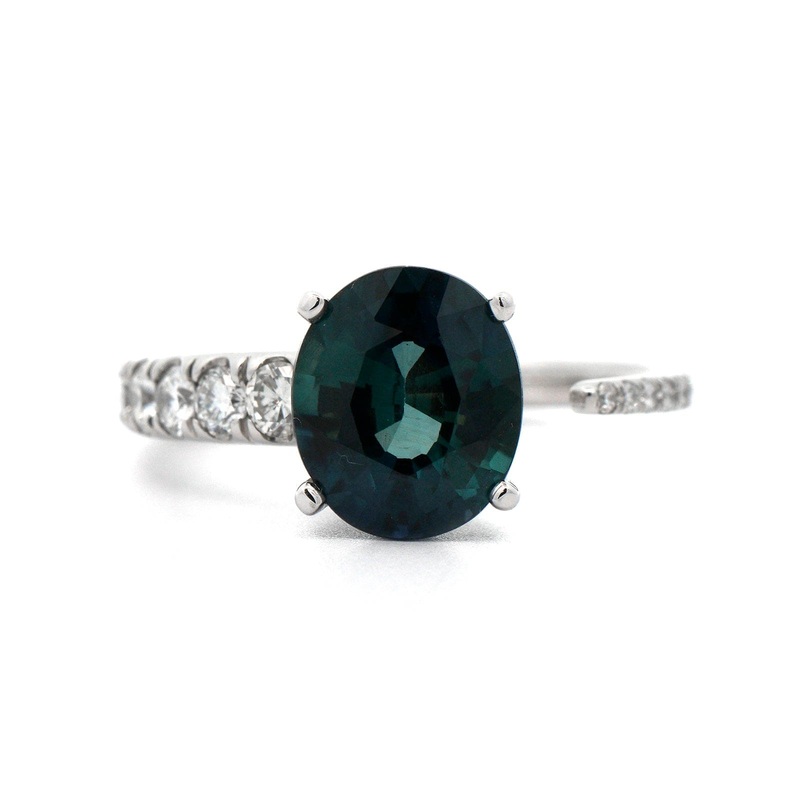 PlatinumSapphire weighs 2.53ctw.8.93 x 7.59mmDiamonds approx. .46ctw.