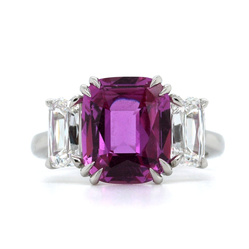 Platinum ring with cushion cut pink sapphire center and modified elongated cushion cut diamond on each side.