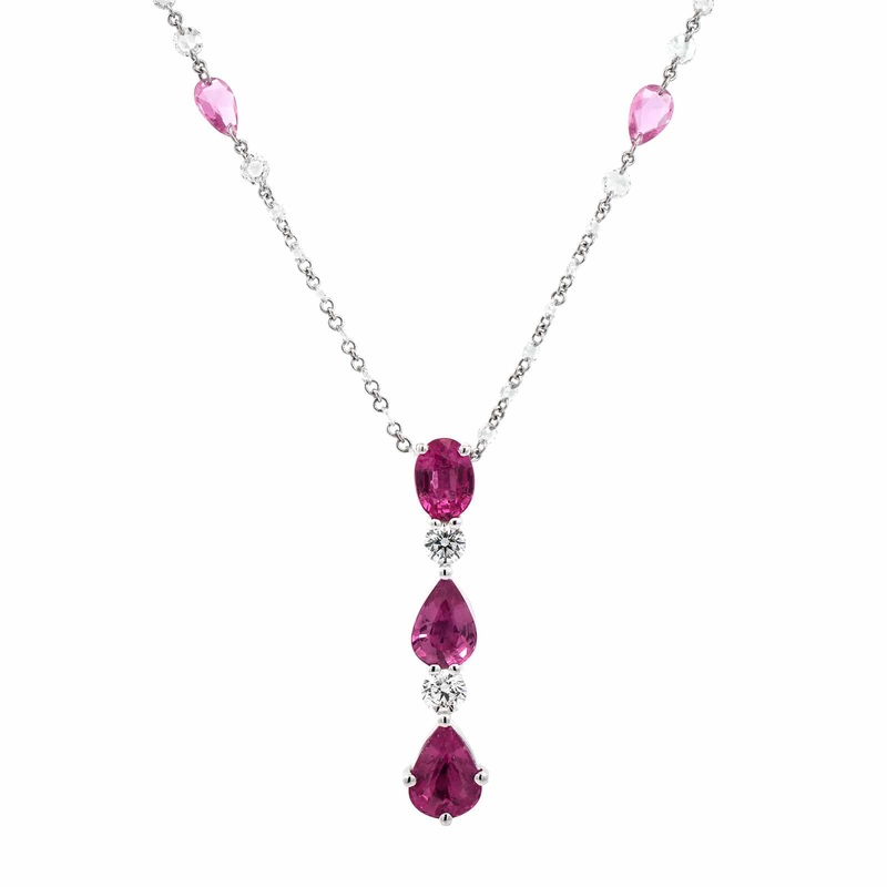 Platinum diamonds by the yard necklace featuring pink sapphires and round diamonds.