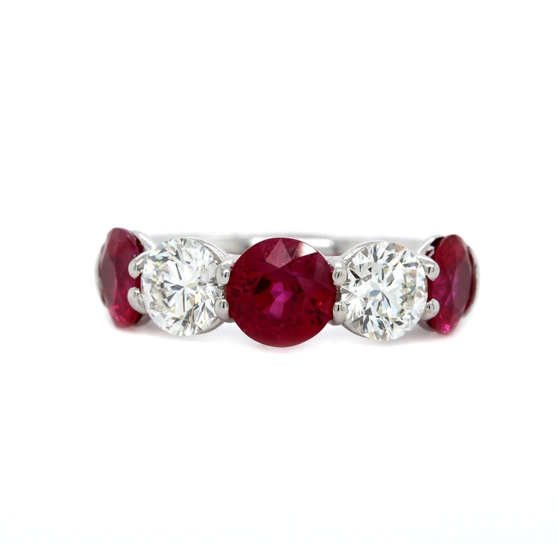 Platinum 5 stone band alternating with round rubies and diamonds.