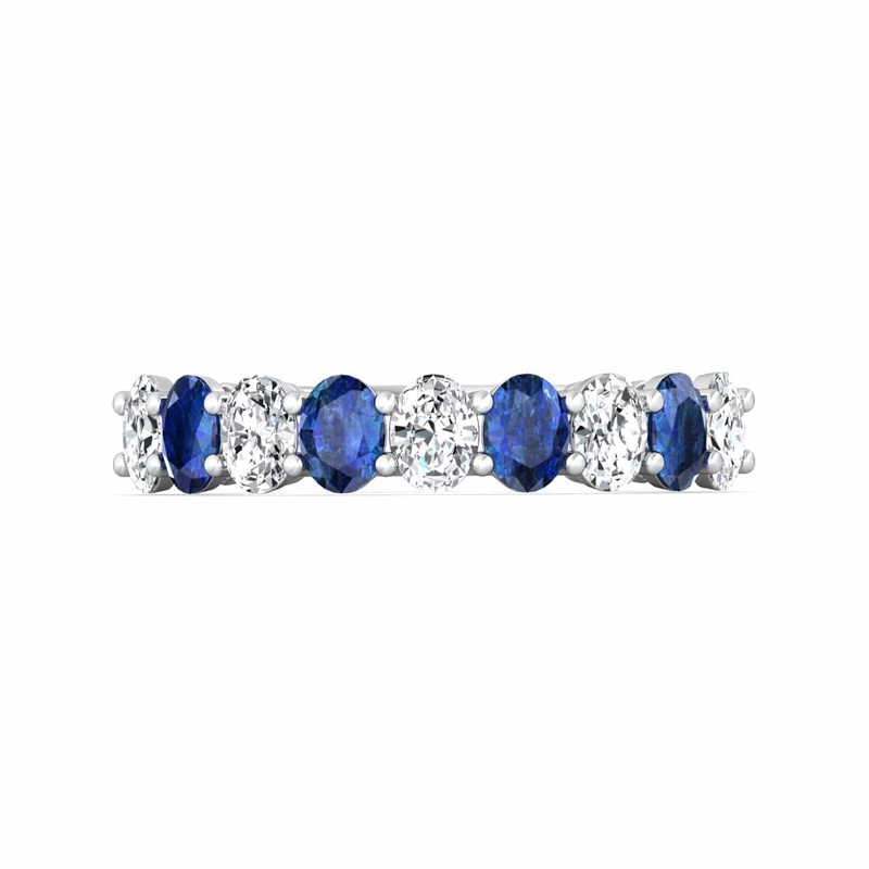 Platinum shared prong band with 4 oval blue sapphires and 5 oval diamonds set east to west.