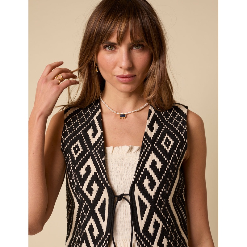 The waistcoat youll wear on repeat. In a bold black and white jacquard with tie-front detail, simply style it over everything this summer.