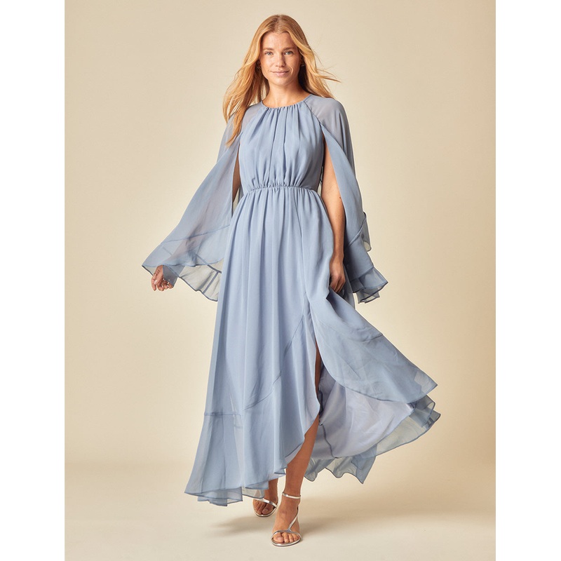 The ultimate boho dress. In a perfect pastel blue, our floaty dress features ruffled cape-style sleeves and a high low hem thats made for movement. Round neck Flared sleeves Elasticated waist for comfort Open back Side slit Designed to be semi-fitted Size