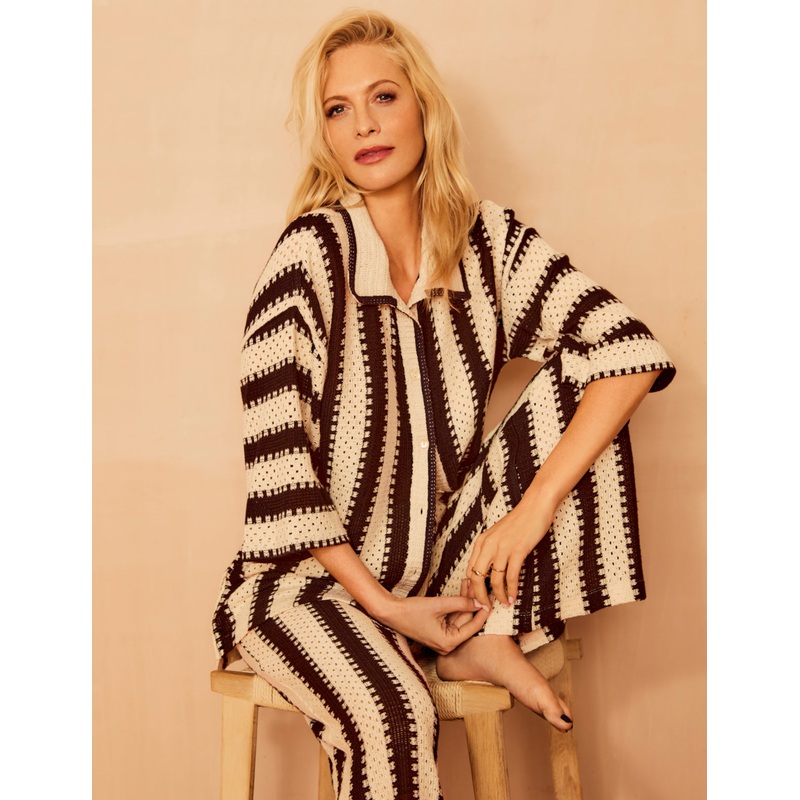 The top with impact. In a stone and brown stripe our collared textured shirt has relaxed yet statement vibes. Wear it with the matching trousers for the full look.