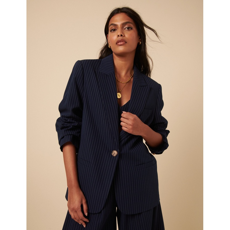 Your new power blazer. Designed in a navy pinstripe, we love the contrast button that pulls it all together. Style with our matching bralette and trousers for the full look.