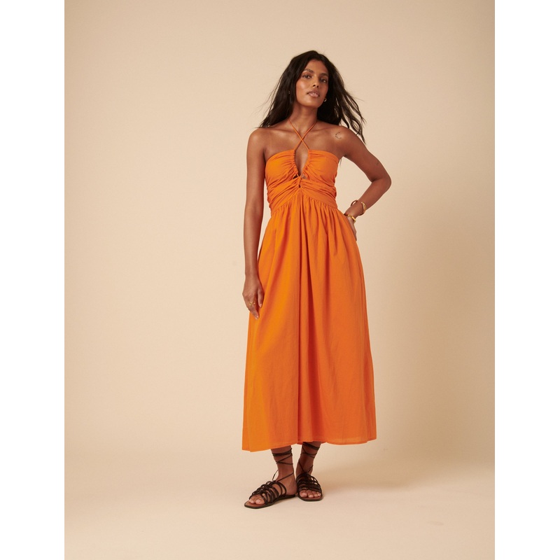 All eyes on you. In a standout orange, our halter midi dress features a ruched bodice, keyhole front and cross-over straps that tie at the neck. Halter neck A-line skirt that skims the body Side pockets Shirred back for comfort Designed to be semi-fitted S