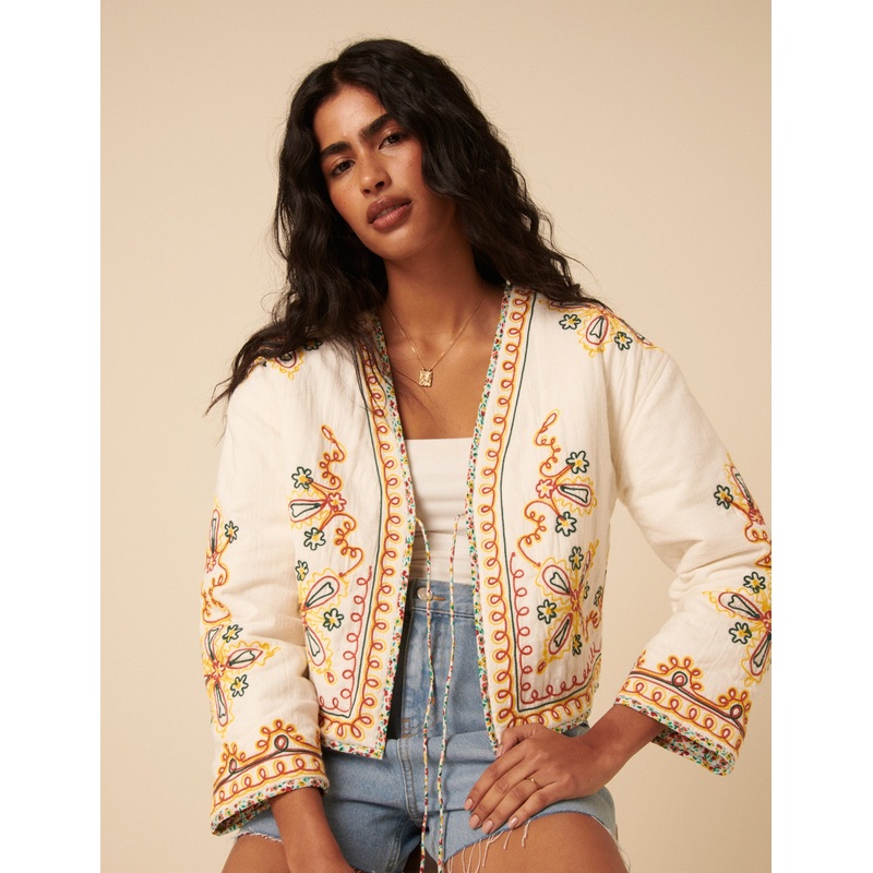 Light and effortless. This white embroidered jacket ties at the front and layers effortlessly over everything. Its perfect for cool evenings and festival days.