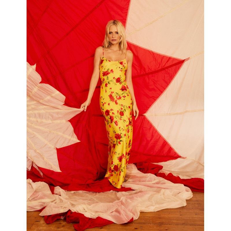 The maxi dress that bring the fun. In yellow and pink floral print, our dress features a scoop neck, tie-back details, a flowing silhouette and a whole lot of summer energy.Scoop neckSpaghetti strapsOpen back with tie detailConcealed zip fasteningDesigned