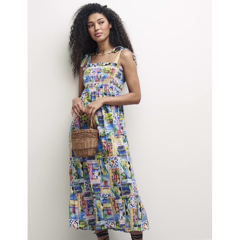This postcard smock dress has us dreaming of sun-soaked getaways. Drawing inspiration from holidays yet to come, Milles decorated with vibrant destinations from all over the world, each hand-drawn and painted by our in-house design team. Shes bordered with ruffles, a tiered midaxi hem and tie-up straps. Relaxed as you need her to be, we suggest you size down if youre into a slimmer fit. Slip a basket bag on your arm and go.