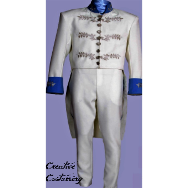 Includes: Dashing double breasted jacket w/tails opulently decorated w/silver trim, trousers w/seam pockets.