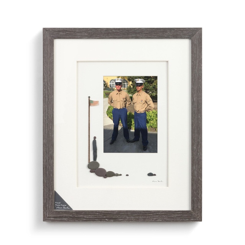 The Proud Frame takes one of the most loved pieces of art from the Sharon Nowlan collection and creates something that can be personalized with a photo. This piece shows patriotism and love of country and is perfect for showing appreciation for someones military service. Sharons compositions offer incomparable heirloom quality and celebrate diverse, meaningful relationships and special places. Personalize this meaningful scene by adding a favorite 5 x 7 photo. Features elements inspired by natural materials like pebbles, sea glass and seashells are artfully arranged to capture simple and profound moments. Sharons reach encompasses themes that fit all of lifes memories.