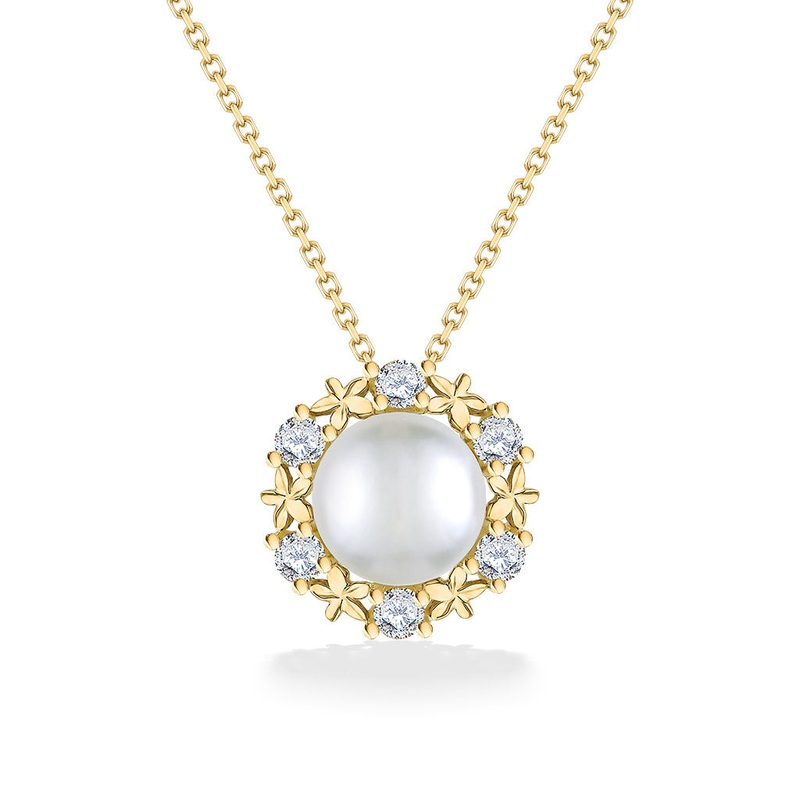 14K Yellow Gold Pua Lei Pendant with a 7-8mm White Akoya Pearl and 0.18 Carats (total weight) of Diamonds. 17" 14K Yellow Gold Chain included. The pendant measures approximately 7/16" in diameter.