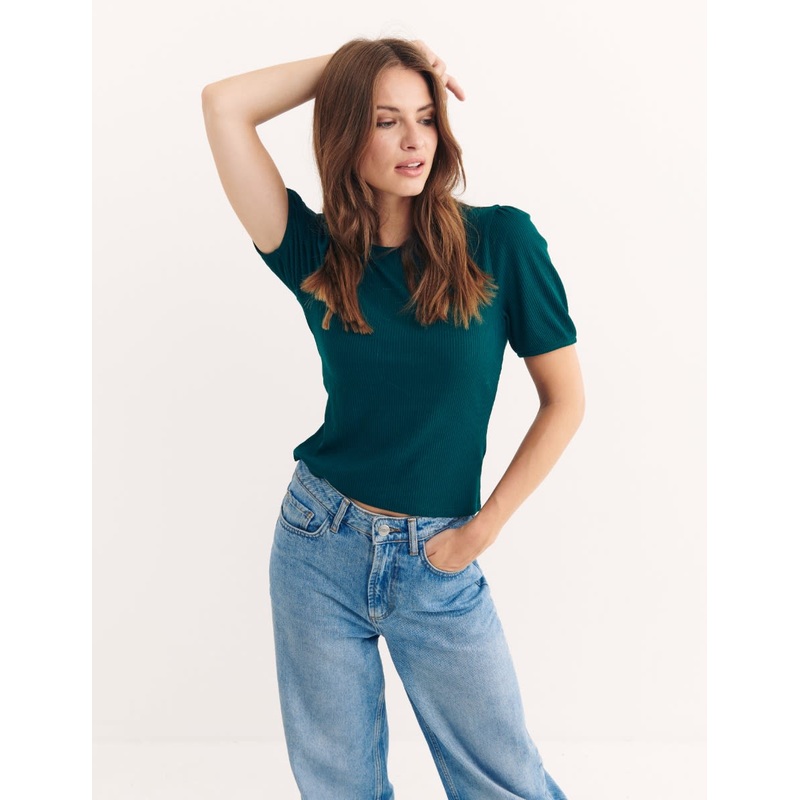 For nicer than nice tops, you're in the right place. This puff sleeve piece is crafted from a soft EcoVero Lenzing blend with extra stretch for added comfort. It features a slim fit, short sleeves and a timeless round neckline. Wear this green piece with d