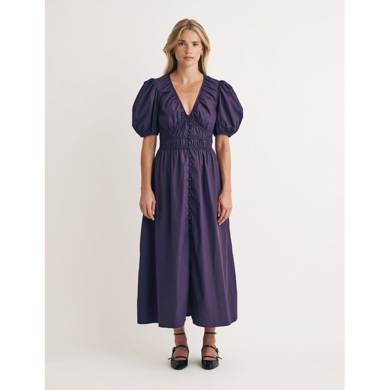 Meet Lilah, a new midi dress thats just arrived. Made entirely from organic cotton, we love her in a dark purple shade. We just cant get enough of her classic button front, super puffy sleeves and shirred bodice. Style yours with strappy heels. V-neck Mid-