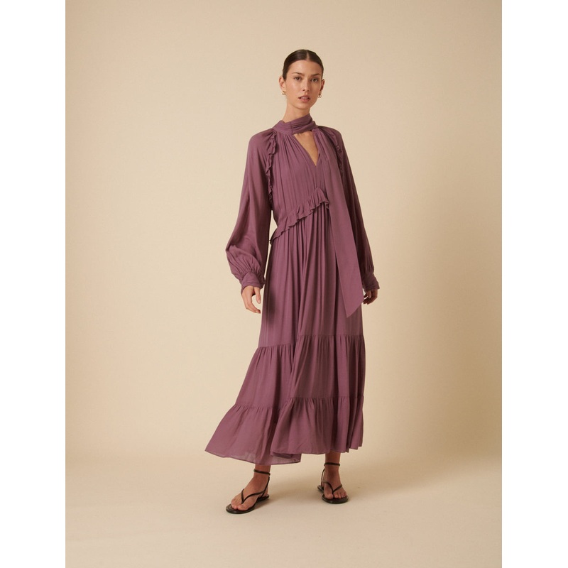 So now, so 70's. Introducing Bohana, your new favourite autumn dress. This head-turning midi comes in purple. Featuring a classic v-neck, long balloon sleeves and romantic ruffles, shes ideal for any occasion. We love her stylish neck scarf too. Switch her