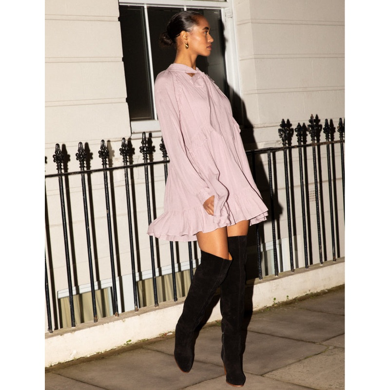 Weve taken everything you loved about Bohana and made her a mini. This head-turning dress comes in purple. Featuring a classic v-neck, long balloon sleeves and romantic ruffles, shes ideal for any occasion. We love her neck scarf too. Switch her between boots and barely-there sandals.