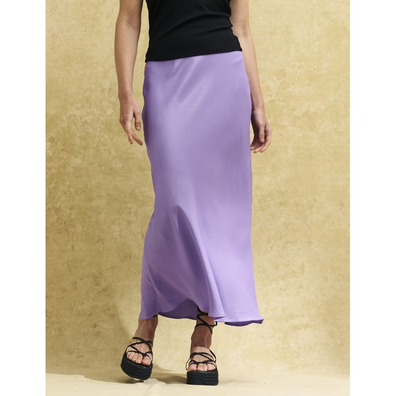 Our sell-out Mila skirt is back in lilac satin. It IS a body-skimming cut that flares at the hem. Team yours with chunky sandals for dining alfresco.Elasticated waistBias cut