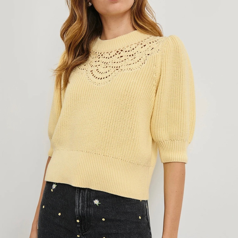 The Steph blends blouse, sweater, and tee for the ultimate transitional top in a cotton knit fabrication. It features a crew body with crochet at the neckline, and has a mid-weight feel that works year-round.