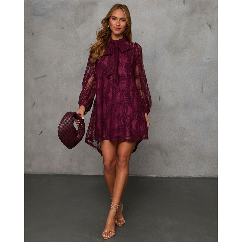Step into elegance with the Rather Be Necktie Lace Mini Dress. This dress features a delicate lace fabric overlay that adds a touch of timeless beauty, while the attached necktie accent brings a playful, feminine flair. Blouson sleeves with elastic cuffs g