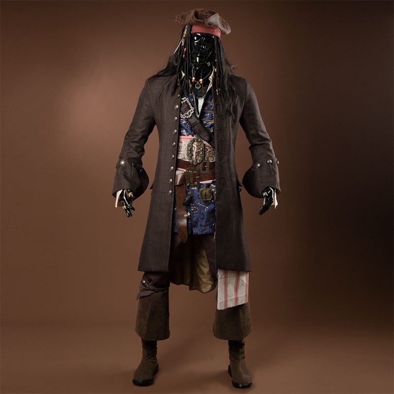 Captain Jack Sparrow cosplay costume with authentic pirate detailing, available in our exclusive size chart from XS4XL. Custom sizing is also supported (+$30) for a personalized fit.