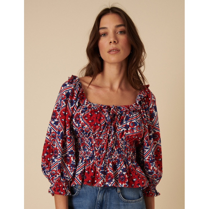 Oh this new number? This printed top is sure to bring all the compliments. She comes with a square neckline, ruched bodice and balloon sleeves. Its finished with pretty ruffles and tie detailing. Wear with our matching Teri skirt for a coordinated look. Sq