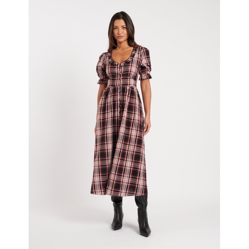 Introducing Flossie, the perfect dress for fall. Pretty additions include puff sleeves, a frilled collar and panelled waist designed to flatter. Pair with a chunky cable knit and your favourite stompy boots.Round neckShort puff sleevesButton frontPanelled