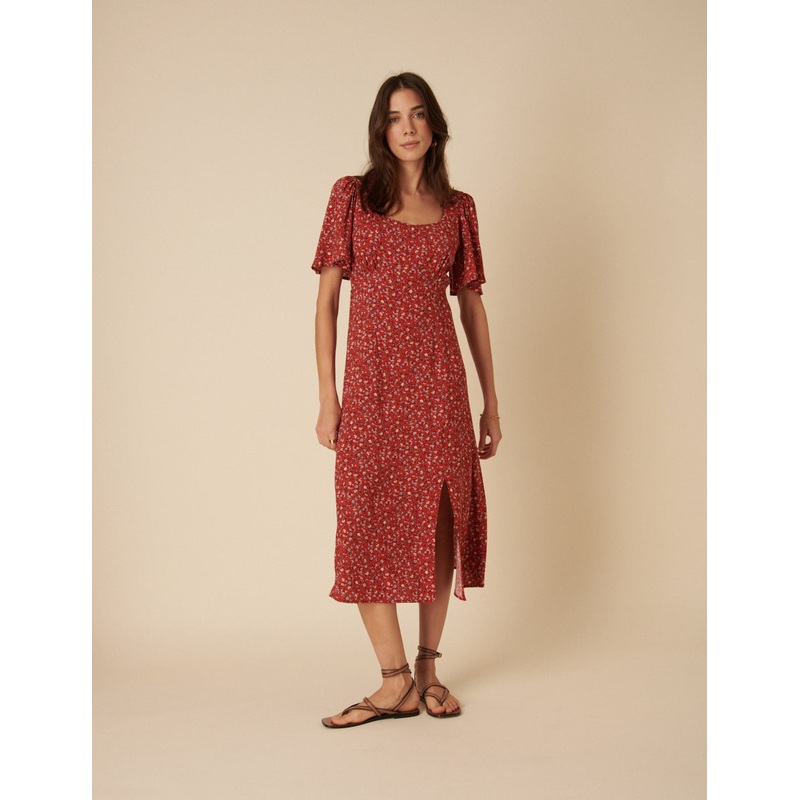 Your favourite Dee Dee dress back. Decorated in red ditsy florals, we love her scoop neck, feminine fluted sleeves and a subtle slit that elongates the leg. Switch between suede boots and barely-there sandals.