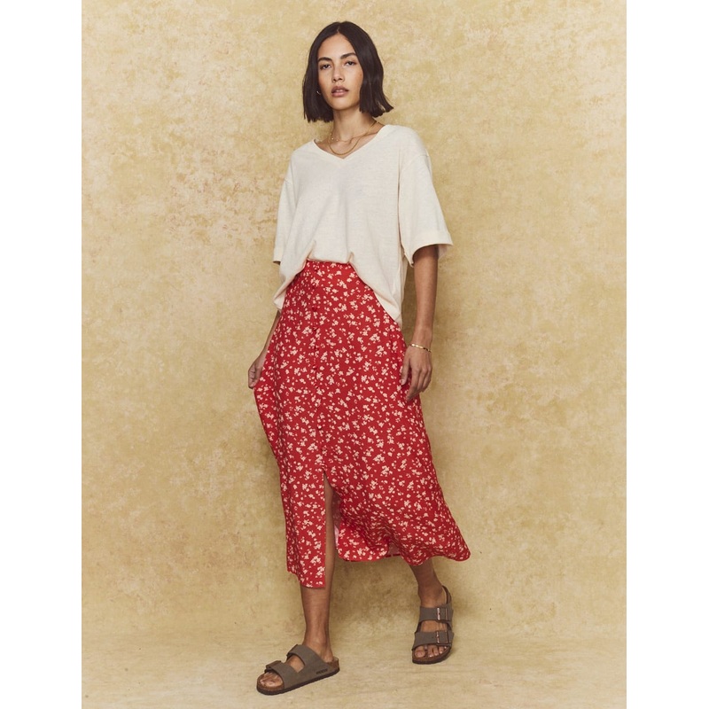 New midi skirt alert, this time in the form of Sadie. She's sunshine-ready in saffron red florals. Covered buttons line the front of this swishy piece, with a nipped-in waist that falls to fluted fit with a stylish centre slit. Style yours with chunky slid
