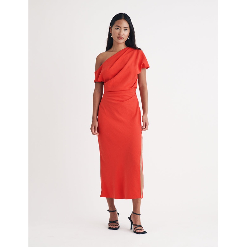 So one-sided. Tapping into the seasons most timeless trend, Katty drapes elegantly over a single shoulder in red. Dont miss the flattering side slit. Elevate yours with gold jewellery. One-shoulder style Designed for a close cut Side slit
