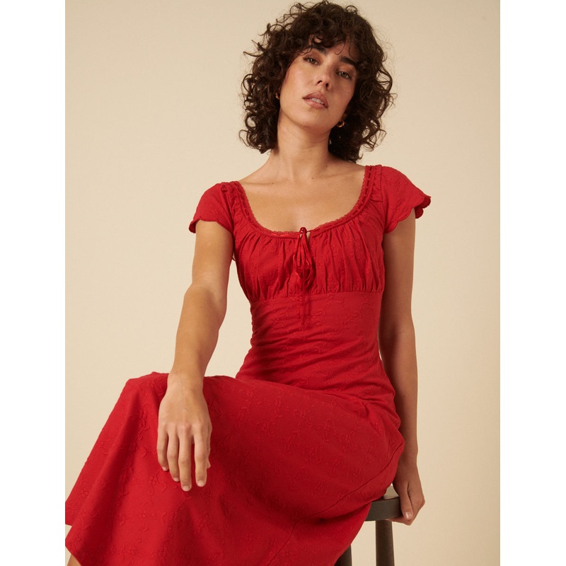 Meet Melissa. Coming in hot red, we love the tie detail at the round neckline. Shes a classic summer dress with romantic edge. Just add touches of gold. Scoop neck Short sleeves Size tip: we recommend your usual size