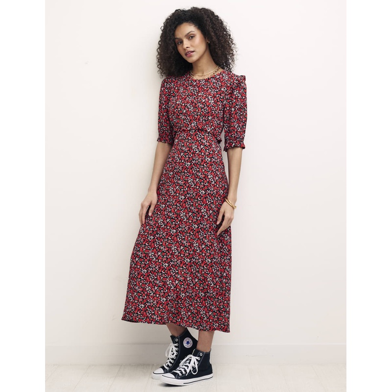 Another Felicia dress for your collection. Outlined with subtle ruffles and gathered sleeves, its the details that set this style apart. We love her with high tops for whatever youve got planned. Round neck Mid-length puff sleeves Concealed zip Curved wais