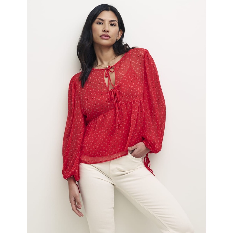 As far as blouses go, the Giovanna is one to remember. The red top features a relaxed fit, a sheer finish and a self-tie neckline and sleeves. Patterned all over with a ditsy poppy print, she pairs well with denim and smart trousers for the season.