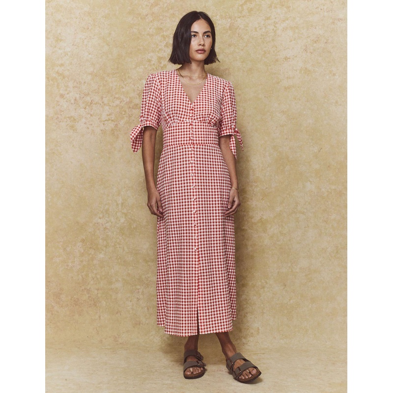 Slip into this red gingham tea dress. Alexis follows your frame beautifully with pretty bow ties on the sleeves. Weve also added a subtle shirred back to gently pull you in at the waist. Style yours with chunky slides and make plans.