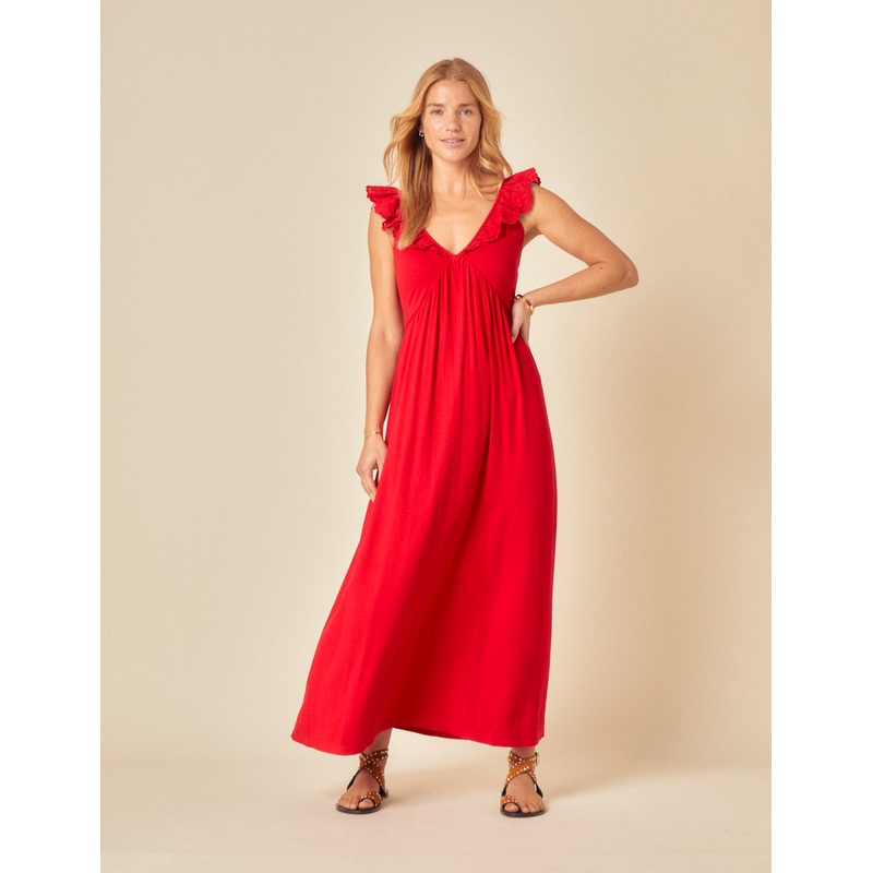 Meet your new favourite dress. This head-turning maxi comes in a statement red. Featuring a classic V-neck and romantic ruffles, shes perfect for everything. V-neck Frilled lettuce hem Underbust seams designed to flatter Designed to be semi-fitted Size tip