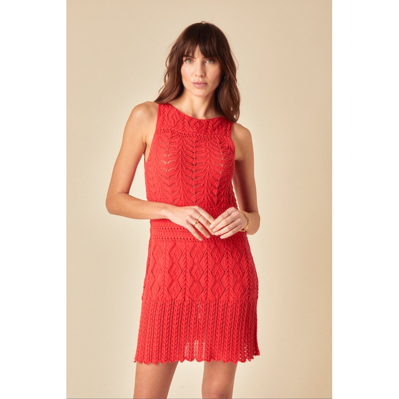 Red hot summer. This swing mini dress is crafted from all-over crochet and made for easy summer styling.