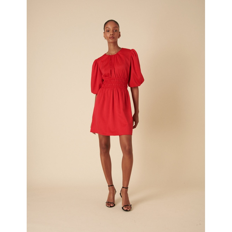 Add to basket. This statement red dress will be your new go to. With elasticated detail at the waist, voluminous short balloon sleeves and a swishy mini skirt for balance. Just add your favourite gold jewellery and youre good to go.