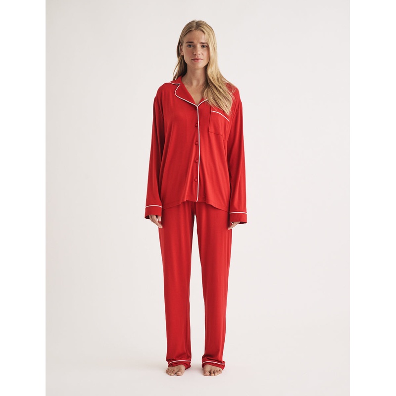 What a dream. It doesnt get cosier than this red nightwear set. We love the white trims, so-now collar detail and super soft texture. Add to your night-time routine for an extra flair of self-care. V-neck Collar Patch pocket Long sleevesElasticated waist f