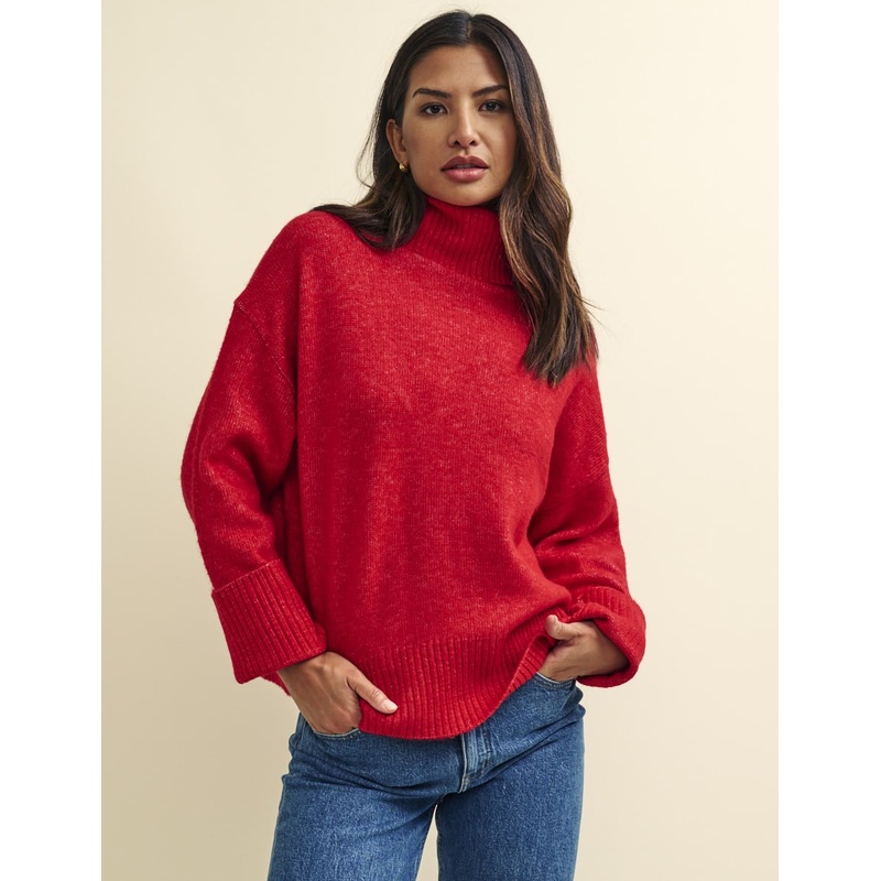 It doesnt feel like autumn until youve pulled a roll neck jumper on. We love the statement red shade. Style yours with your favourite denim.Roll neckRibbed trimsDesigned for a relaxed cutDesigned for an oversized fit, if you are looking for a closer cut pl