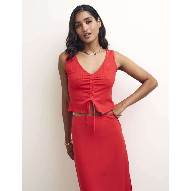 Meet us in the midi. With a drawstring running through the centre, this red gathered top is as cropped as you need it to be. Show off your waist with the matching skirt. V-neck Adjustable drawstring Ribbed texture Soft stretch jersey fabric Designed for a