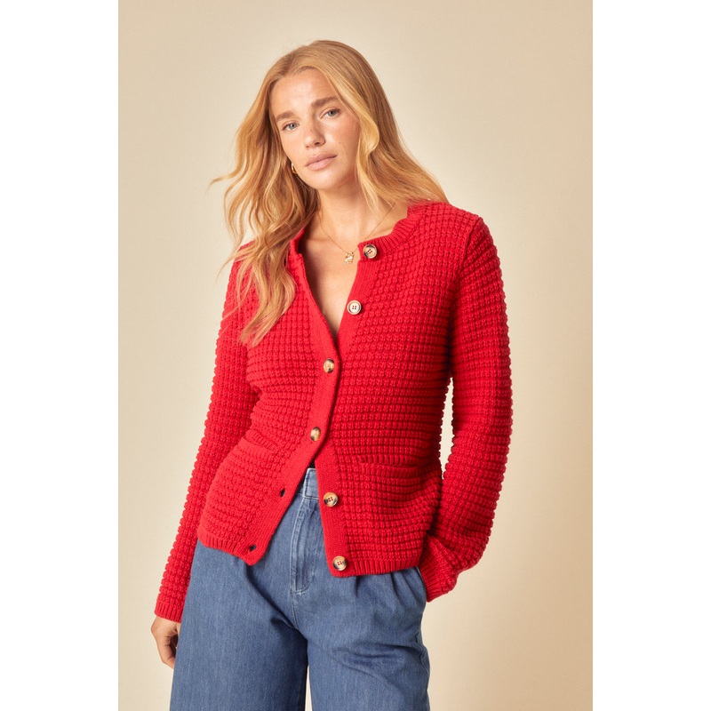 Your new wear-on-repeat style. This cable knit cardigan is the perfect piece for now. We love the contrasting buttons, ribbed trims and the bold red shade.