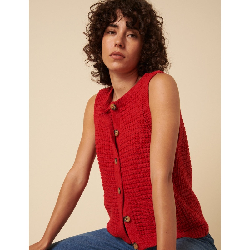 Your new go-to layer. Coming in fiery red, our knitted waistcoat is all about texture and charm. We love the contrast button front, chunky knit, and patch pockets. Layer it over a tee or style solo with jeans. Sleeveless Chunky knit Button-up front We reco