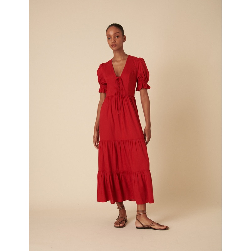 We love Lia. Coming in a hot red shade, our tiered midi dress is your answer to sunny days. We love V-neckline finished with tie detailing and the swishy tiered skirt. Style with sandals. Low V-neck Short sleeves Concealed zip fastening Designed to be semi