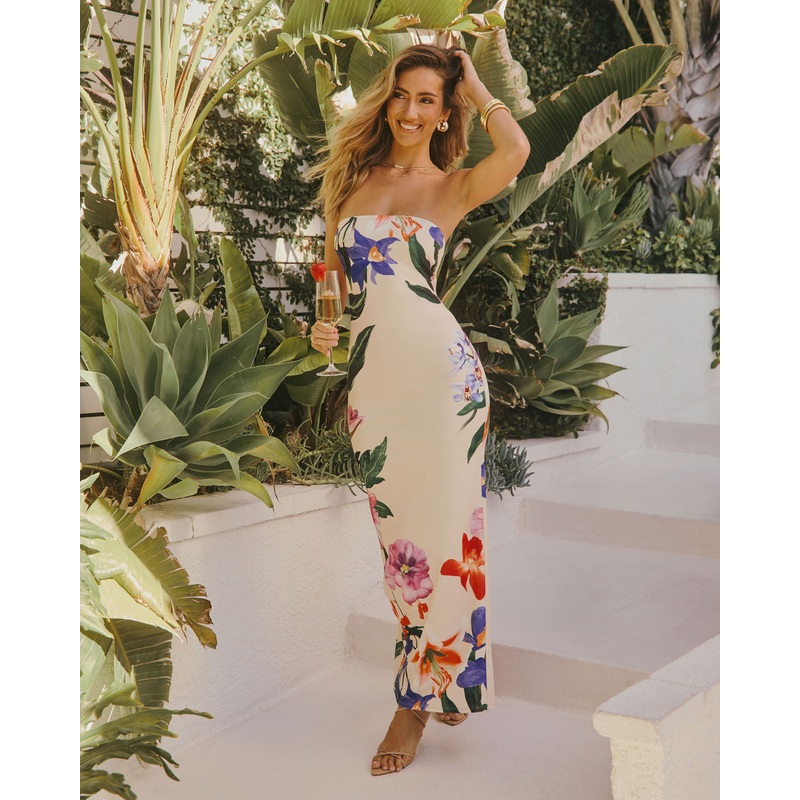 Say hello to your showstopper moment. The Remina Floral Maxi Dress was made for romantic strolls, sunset dinners, and every dreamy escape in between. Designed in soft crepe jersey with a luxe drape and elegant floral print, this strapless silhouette brings
