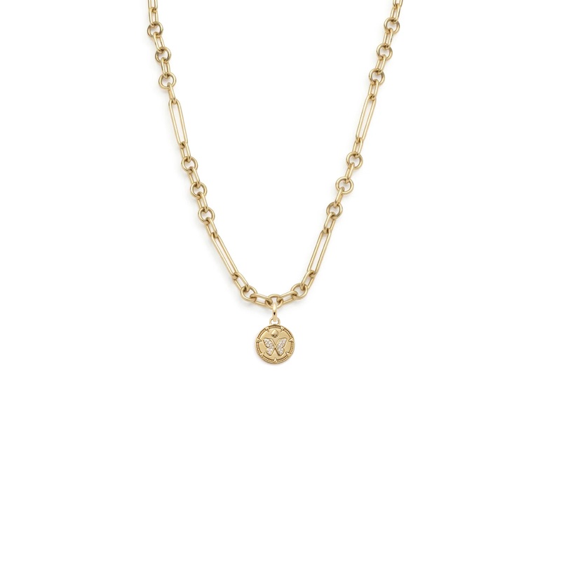 Crafted in 18k Yellow Gold and fused with blue enamel, this 18″ Small Mixed Clip Necklace symbolizes Reverie. Joy is fulfilling what we are meant to be. Closing the gap between who we are and who we present to the world is our greatest challenge and the only path to joy. When how we appear is really who we are, joy animates us and lets our soul soar freely – like a butterfly.