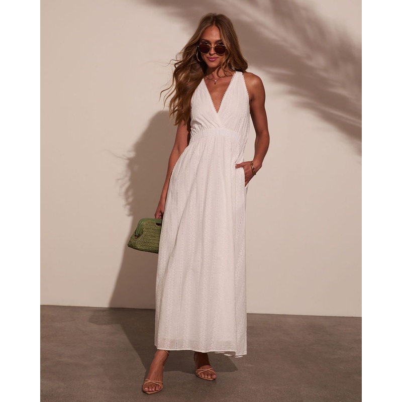 Effortlessly chic, subtly bold, and always event-ready the Reyanne Eyelet Embroidered Maxi will always be the one to answer the call. With breezy floral eyelet fabric and a romantic surplice front, this dress balances soft elegance with a little sass. The open back features elastic crisscross straps for an unexpected twist, while the elastic waistband gives that easy, flattering fit. Perfect for garden parties through to chic daytime brunches with the girls.