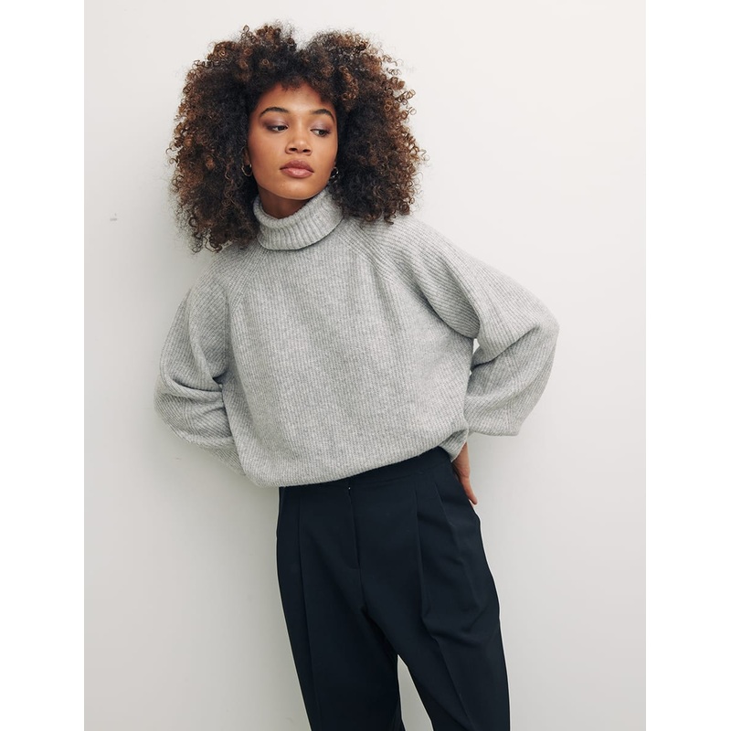 Make a cosy update to your current jumper collection with this green layer. Featuring a funnel neck, voluminous sleeves and ribbed cuffs, the comfortable piece makes for the perfect throw-on over midi dresses, or wear with denim and boots for a casual alte