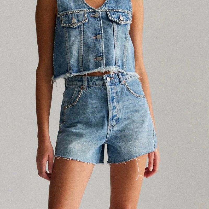 Rollas Mirage Short with Studs.Rolla's exclusive collection with the legendary Australian rock band ACDCHigh-rise shorts designed for a relaxed, cheeky fitTimeless vintage wash with bold stud detailing for a rock n roll edgeRaw hem and zip fly for effortle