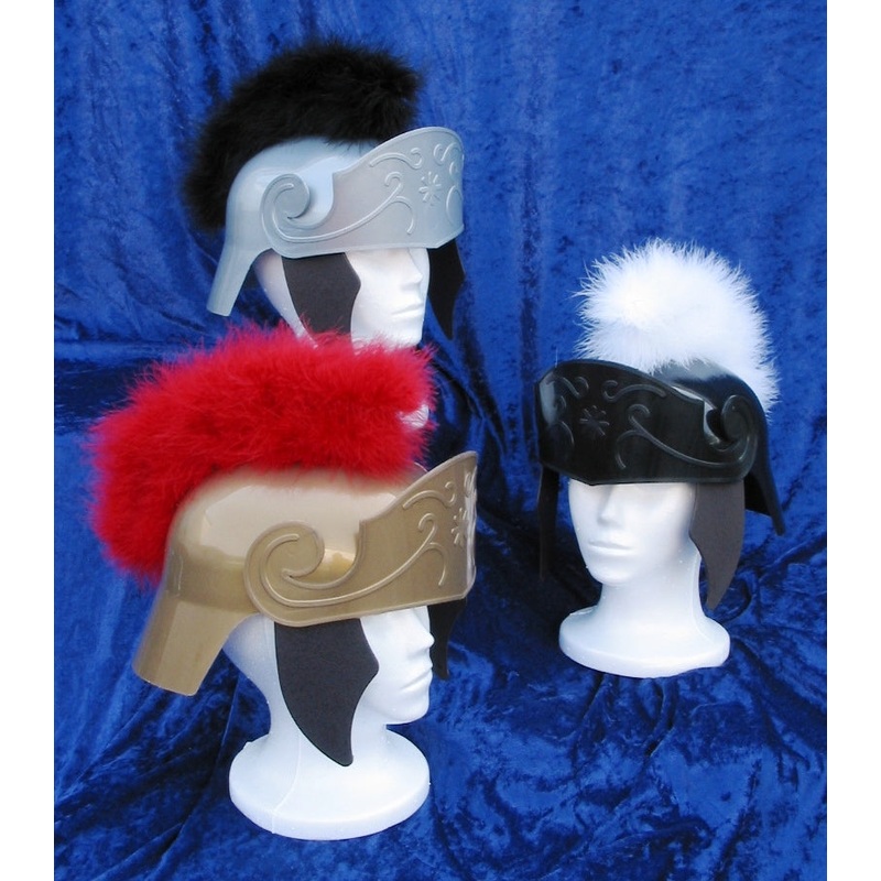 A Royal Officer or a favored Gladiator might wear a helmet such as this one. Most of the helmets used by legionaries had a crest holder. The crests were usually made of plumes or horse hair.This helmet is made of heavy plastic w/visor and a marabou comb.