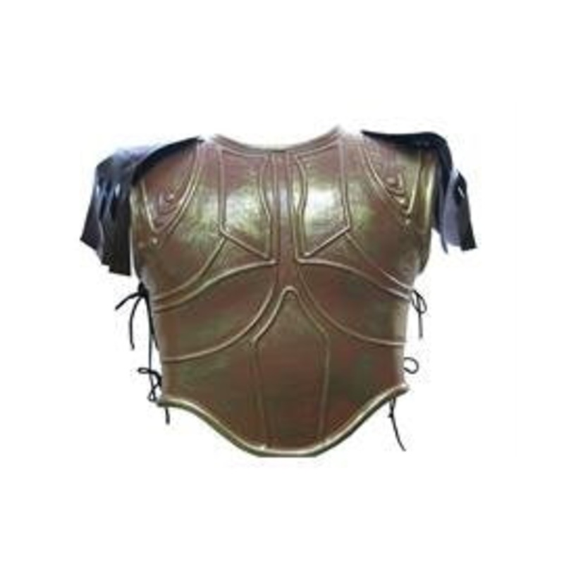 Antiqued Roman Warrior Breastplate. Great for Medieval Knights, Roman Warriors, Gladiators and more.Laces up the side with vinyl cap sleeves (velcro on) /Heavy duty plastic front and back chest pieces with shoulder epaulets.Color: Bronze - AntiquedOne size